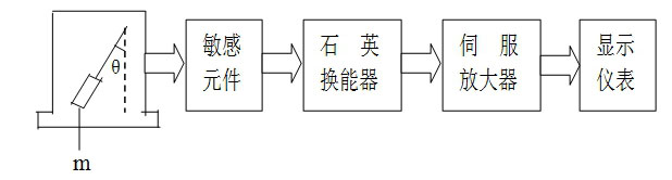主要采用進口石英撓性伺服加速度計為敏感元件,它是一個力平衡式的伺服系統,當傳感器相對于地球重心方向產生傾角θ時,由于重力作用,傳感器中敏感元件相對于鉛錘方向擺動一個角度,通過高靈敏的石英換能器將此角度轉換成信號,經過數據分析處理,可以直接用讀數儀顯示被測點的水平位移量。敏感元件是由接近零溫度系數的熔融石英玻璃制成,具有精度高,穩定性好,重復性高,漂移小,熱穩定性高等優點。原來主要用于航天器上導航,近些年由于成本下降,用于測斜儀,按軍工生產標準生產,可靠性高。儀器原理框圖見(圖一)。