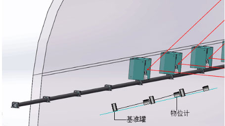 4.確定合適的基準點:物位計的基準點設置以仰拱作基點或安裝在穩定的初支上,將基準罐抬升到與物位計相同高度,保證測量精度,每一個段面一個物位計與一個基準罐,是一個獨立的系統,方便安裝與拆卸。示意圖如下: